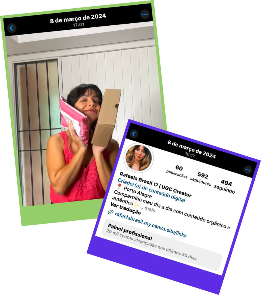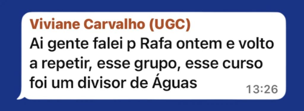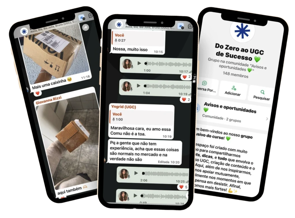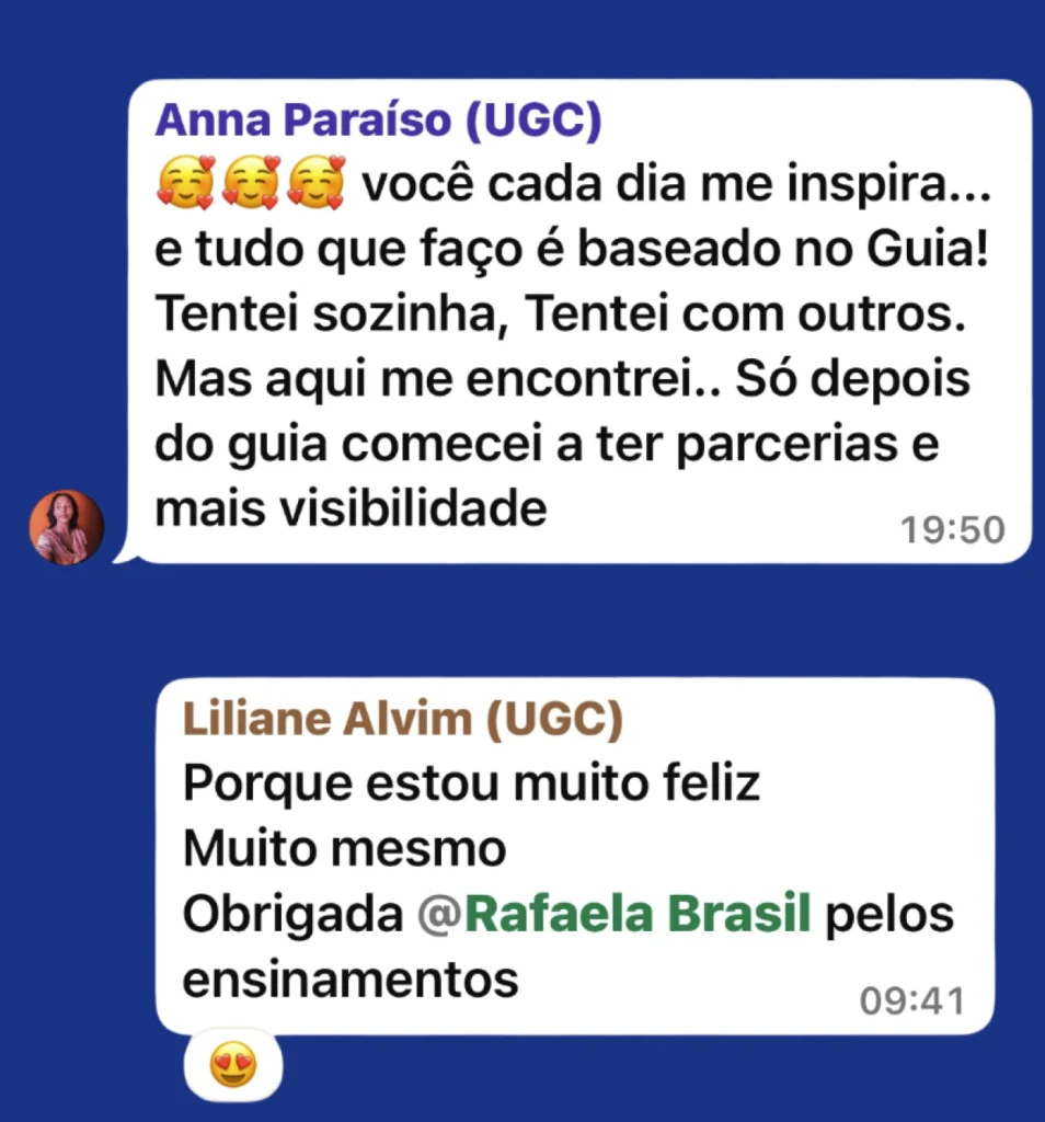 Hoje, compartilho tudo o que vivi e aprendi através do meu método e da minha comunidade de alunas, ajudando outras mulheres a fazer do UGC uma profissão de verdade e a conquistar sua independência no digital.