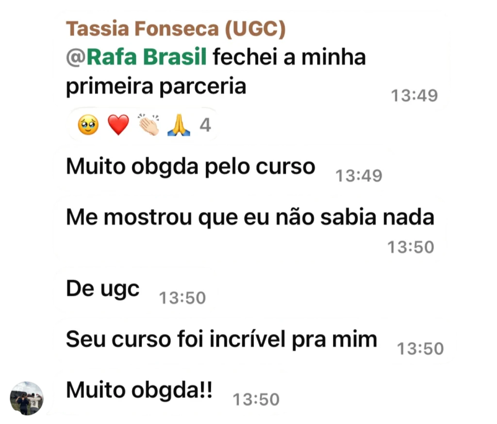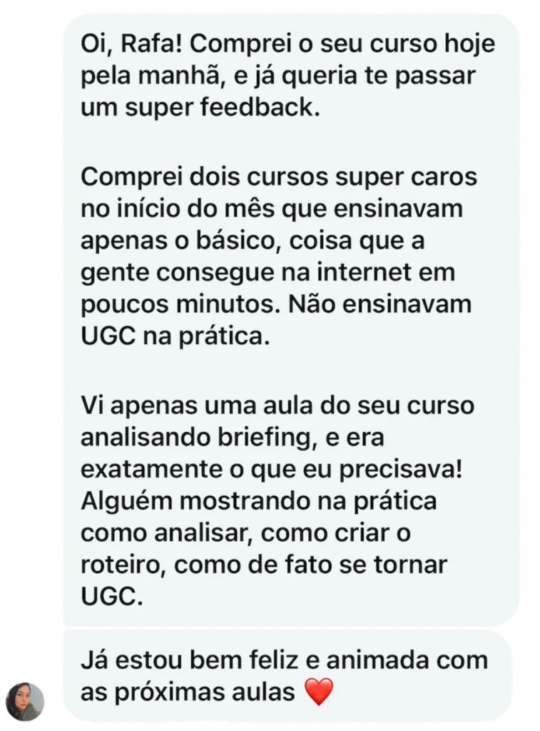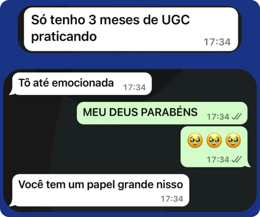 Hoje, faturo mais de 10 mil reais por mês apenas criando conteúdo UGC para marcas, transformando essa oportunidade em uma porta gigantesca para viver do digital. Mas nem sempre foi assim. Sou uma quase engenheira formada, uma profissão que nunca foi o meu sonho, e por muito tempo vivi a frustração de sentir que não estava no caminho certo. Entendo perfeitamente como é ter dúvidas, inseguranças e até medo de arriscar. Foi justamente a coragem de dar esse passo — de apostar no UGC — que mudou completamente a minha vida.