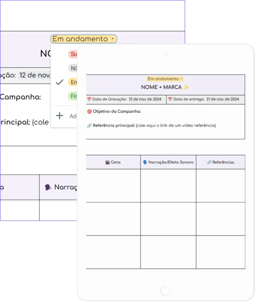 Personalize com facilidade e adicione informações como o status do projeto e prazos, garantindo que tudo esteja sob controle. As marcas adoram a organização, e isso transmite profissionalismo desde o primeiro contato!