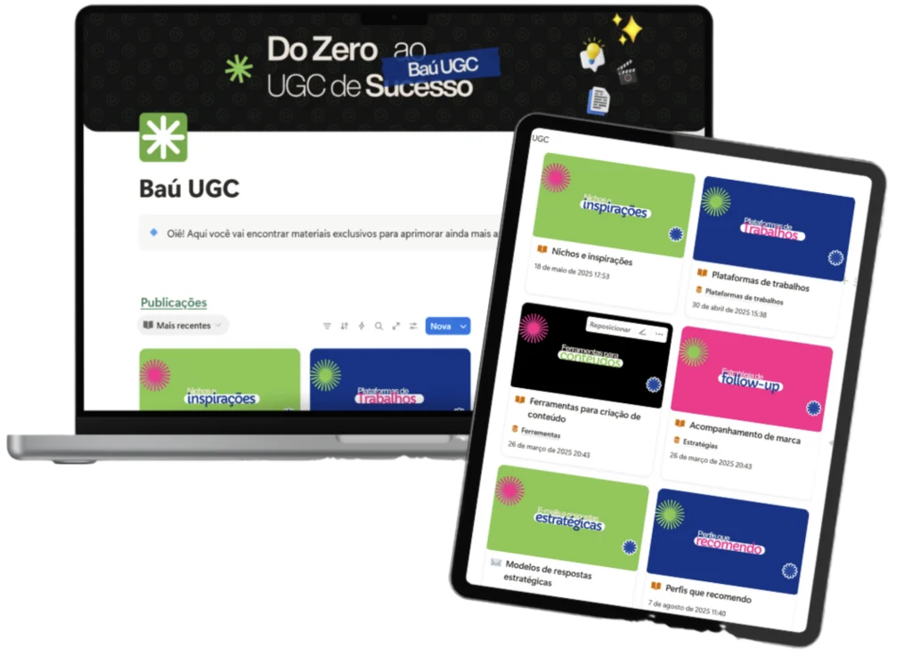 Você também vai receber acesso a uma página exclusiva no Notion, onde reuni os melhores exemplos de vídeos UGC, estratégias de funil, ideias de acompanhamento de marca, modelos de resposta, dicas de equipamentos e MUITA inspiração.