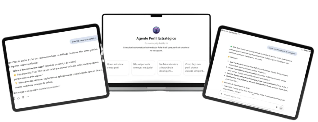 Sucesso entre as alunas! Esses agentes de IA são treinados exclusivamente com o meu método e todo o meu conhecimento, você terá acesso ao Roteirista UGC, Especialista em Conteúdos e ao Agente de Perfil Estratégico.